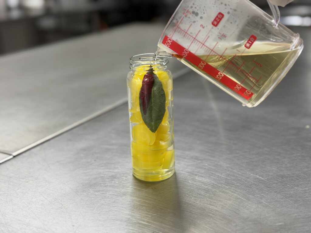 (5)瓶に野菜を詰めてピクルス液を充填します。