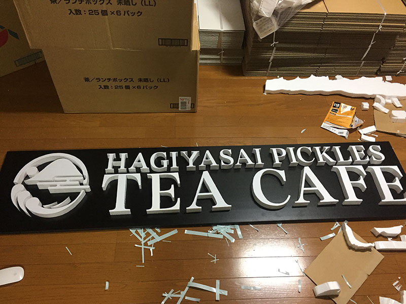 看板は発泡スチロールで自作。製作費3000円。外注したら10万は余裕で取られる。
