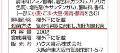 そこに、殺菌方法「120℃4分加熱」や「加圧加熱殺菌済」などの文言が書いてあれば、それはレトルト機がないと作れません。
